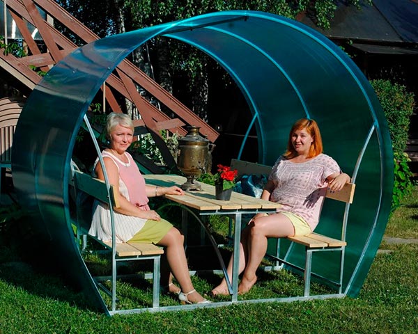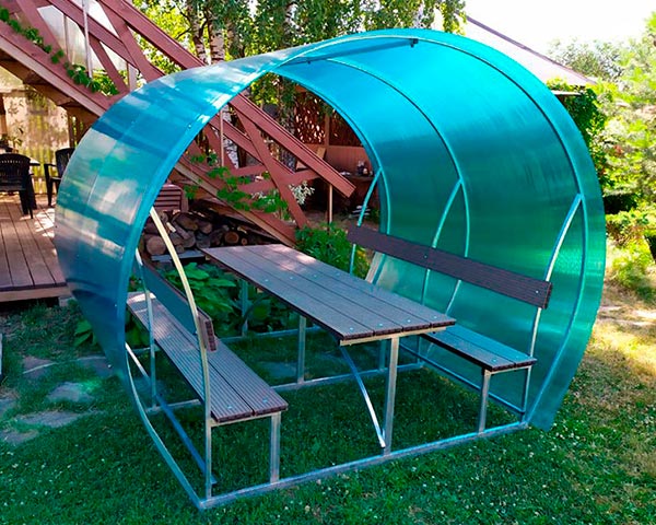 Беседка садовая Пион выполнена в виде полусферы, за счет токого дизайна беседка закрыта с боковых сторон, тем самым создается дополнительный уют так как беседка больше защищена от внешнего воздействия. Беседка Пион станет для Вас уютным местечком на Вашем приусадебном участке где Вы всегда сможете отдохнуть и приятно провести время! Оригинальный и в то же время простой дизайн идеально вписывается в любой ландшафт, а комфорт подаренный этой беседкой не сравнится не с одной другой! Простая и надежная конструкция покрывается сотовым поликарбонатом с ультрафиолетовой защитой, поликарбонат поможет защитить Вас от осадков, а ультрафиолетовая пленка защитит от палящего солнца! Беседка Пион изготовлена из оцинкованной сварной трубы не подверженной коррозии, легко собирается и разбирается с помощью болтов и гаек.