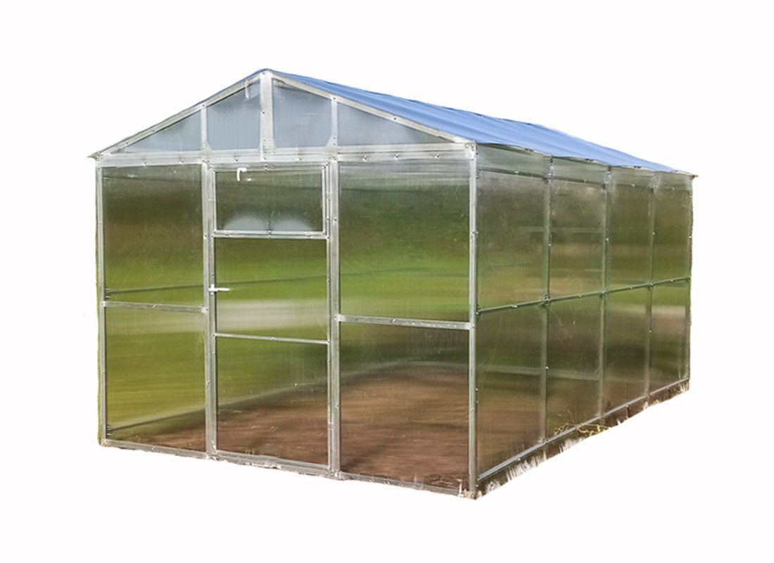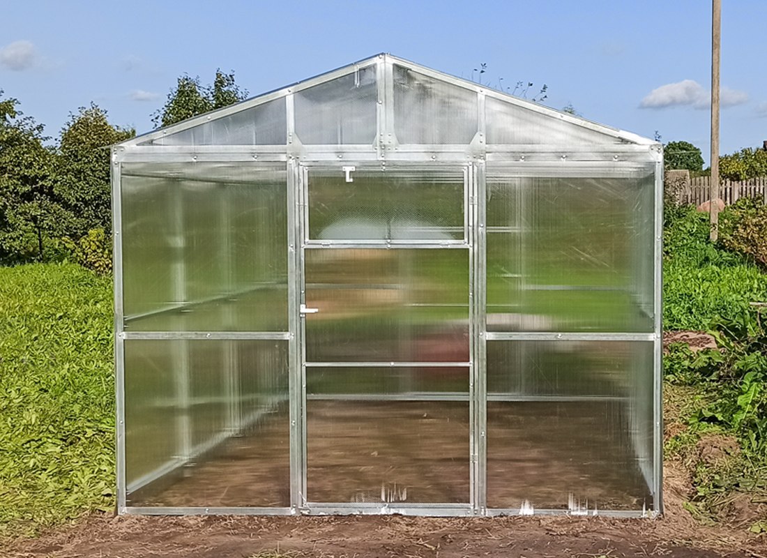 Каркас теплицы изготовлен из оцинкованной трубы квадратного сечения 40×20 мм и предназначен для покрытия сотовым поликарбонатом. Для сборки необходим гаечный ключ или головка 10 мм.
