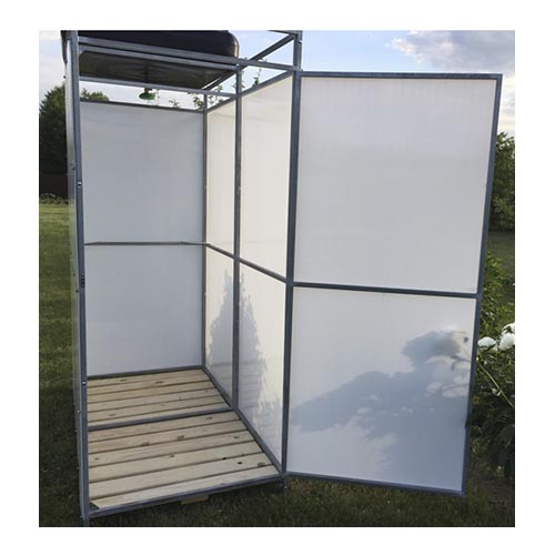 Стенки и дверь покрыты качественным сотовым поликарбонатом молочного цвета, который делает душевую кабину светлой внутри и, при этом, надёжно скрывает Вас от посторонних глаз.